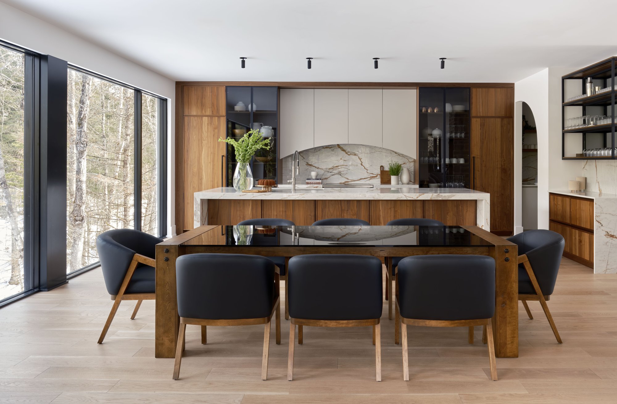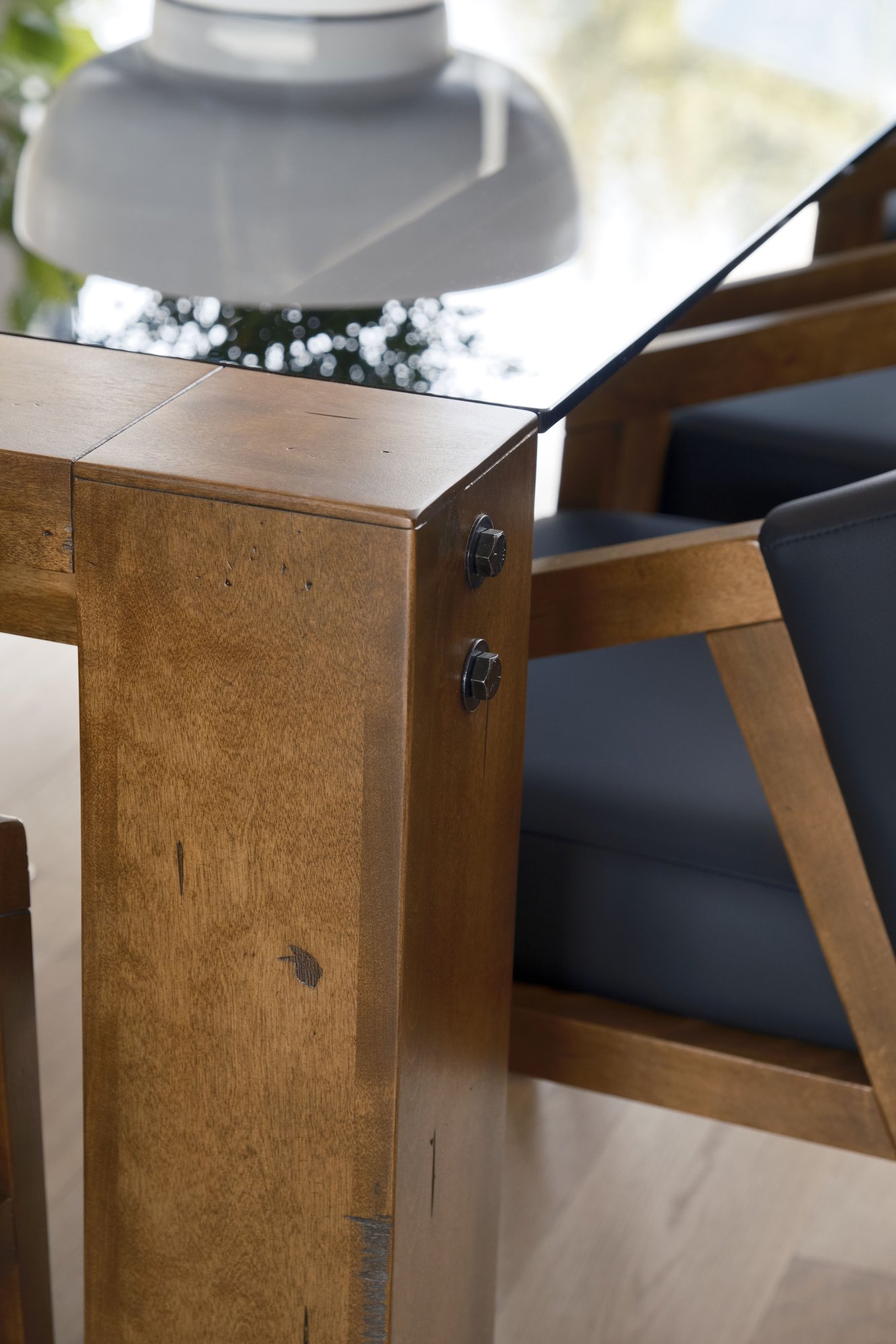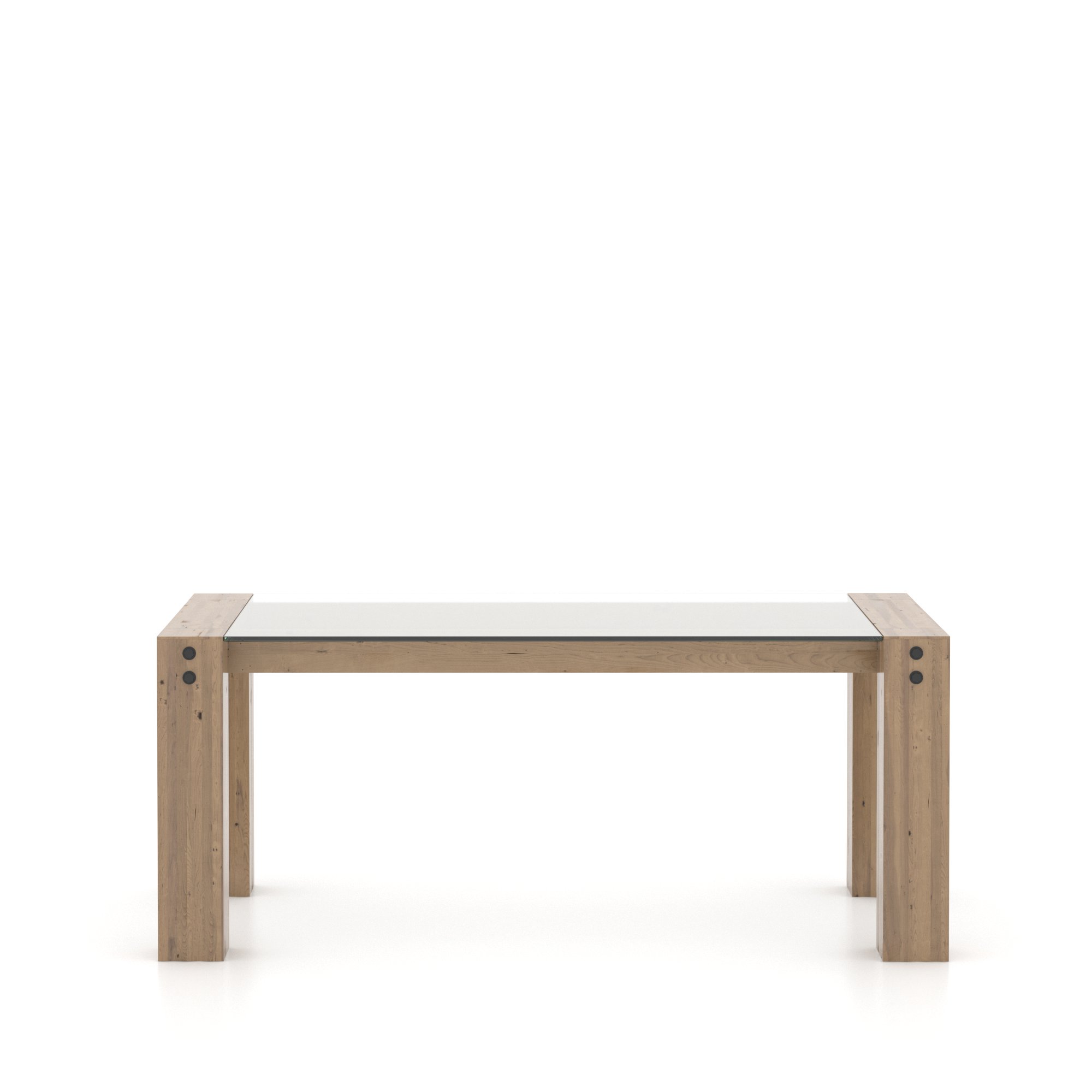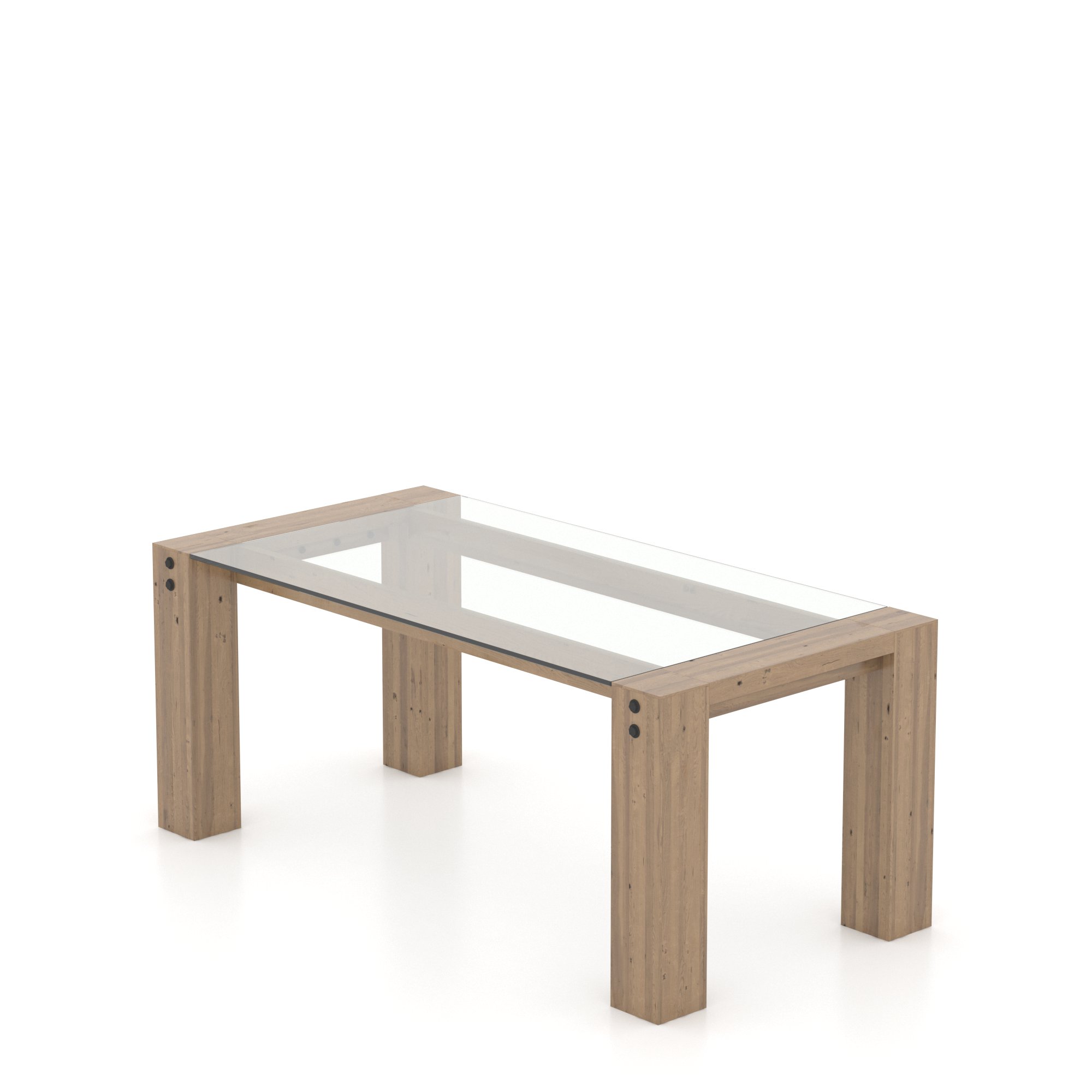 This impressive rectangular solid wood table with a glass top will be sure to charm you. Its modern organic look, stately legs and mix of materials (wood, metal and glass) offers a unique cachet.