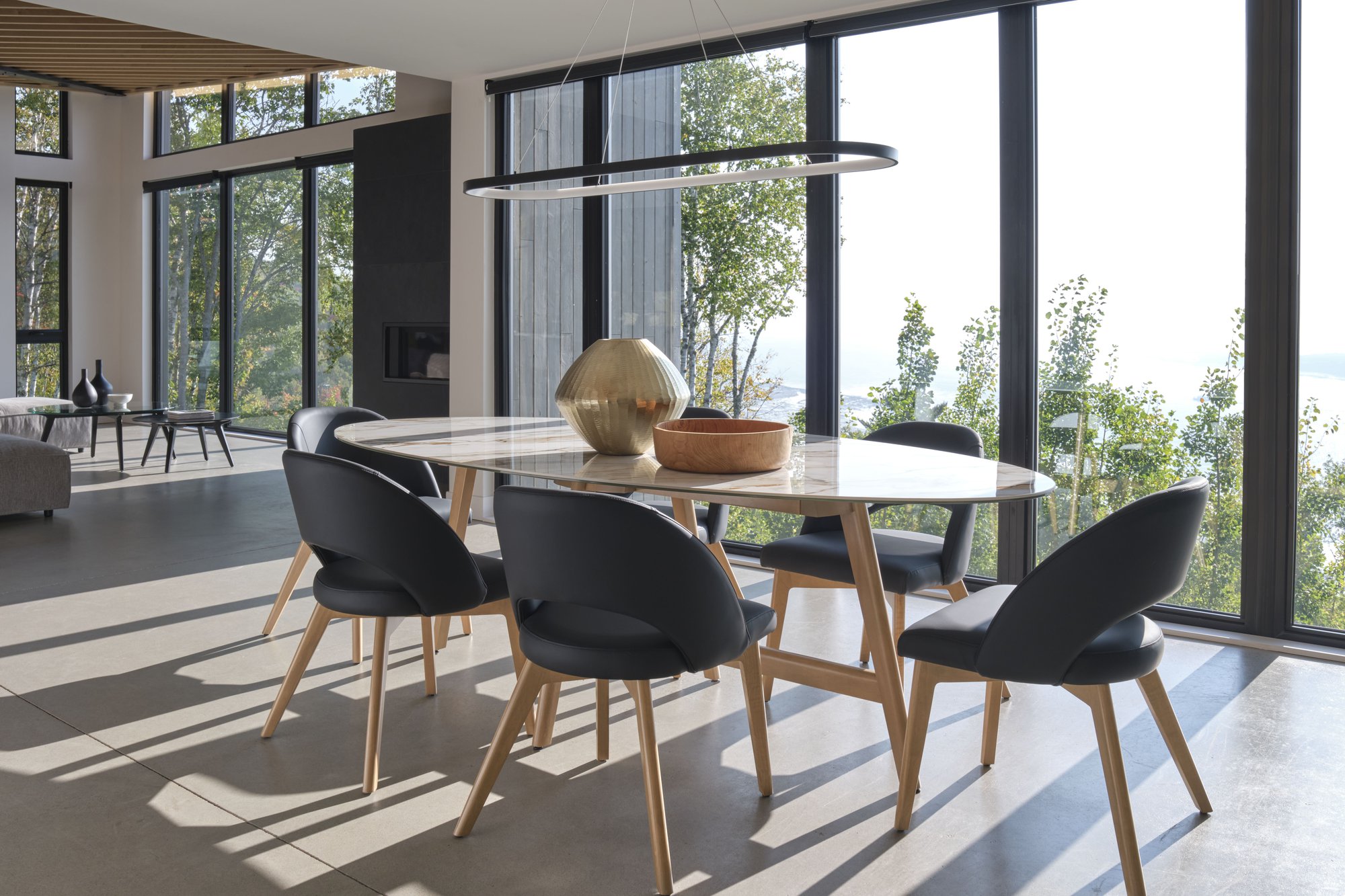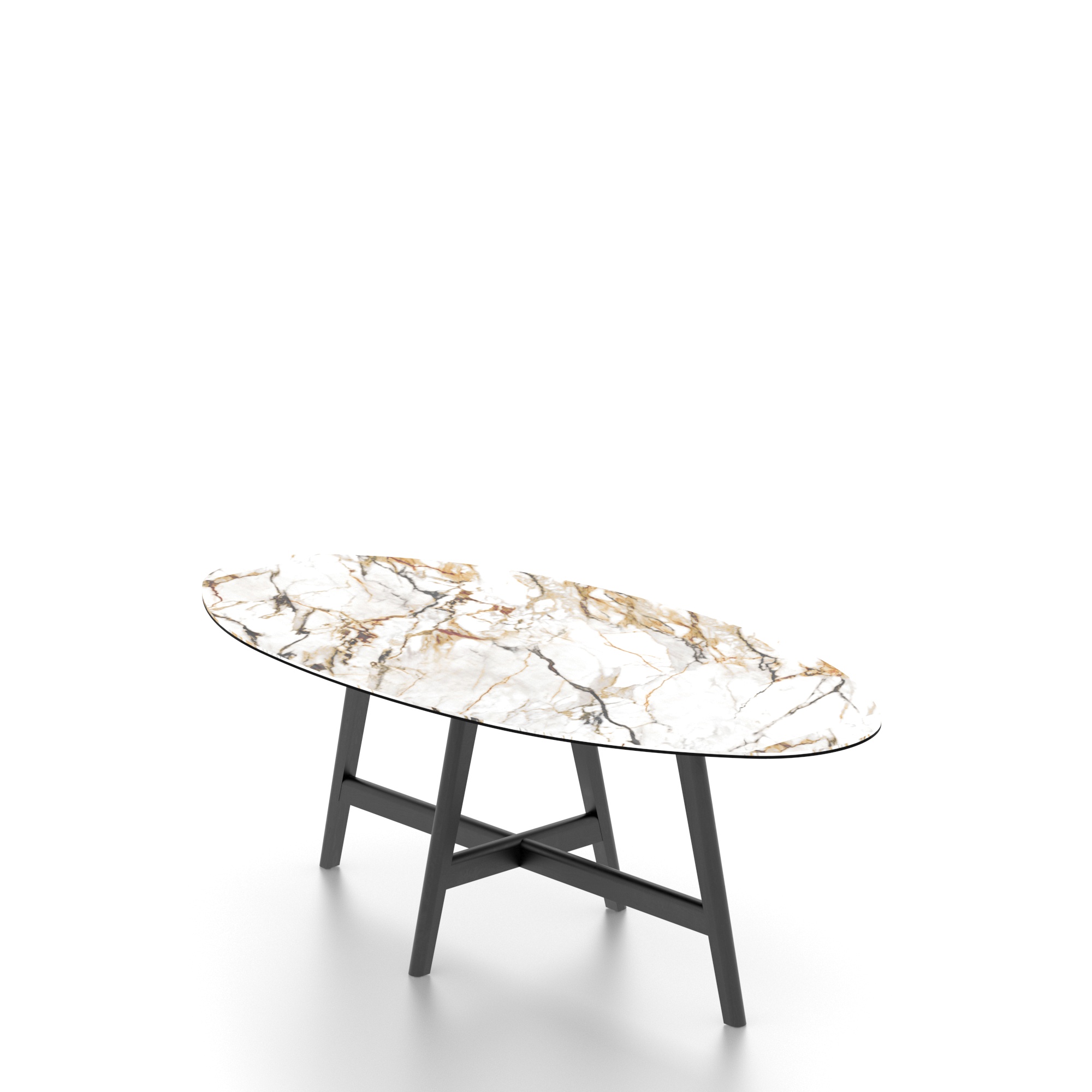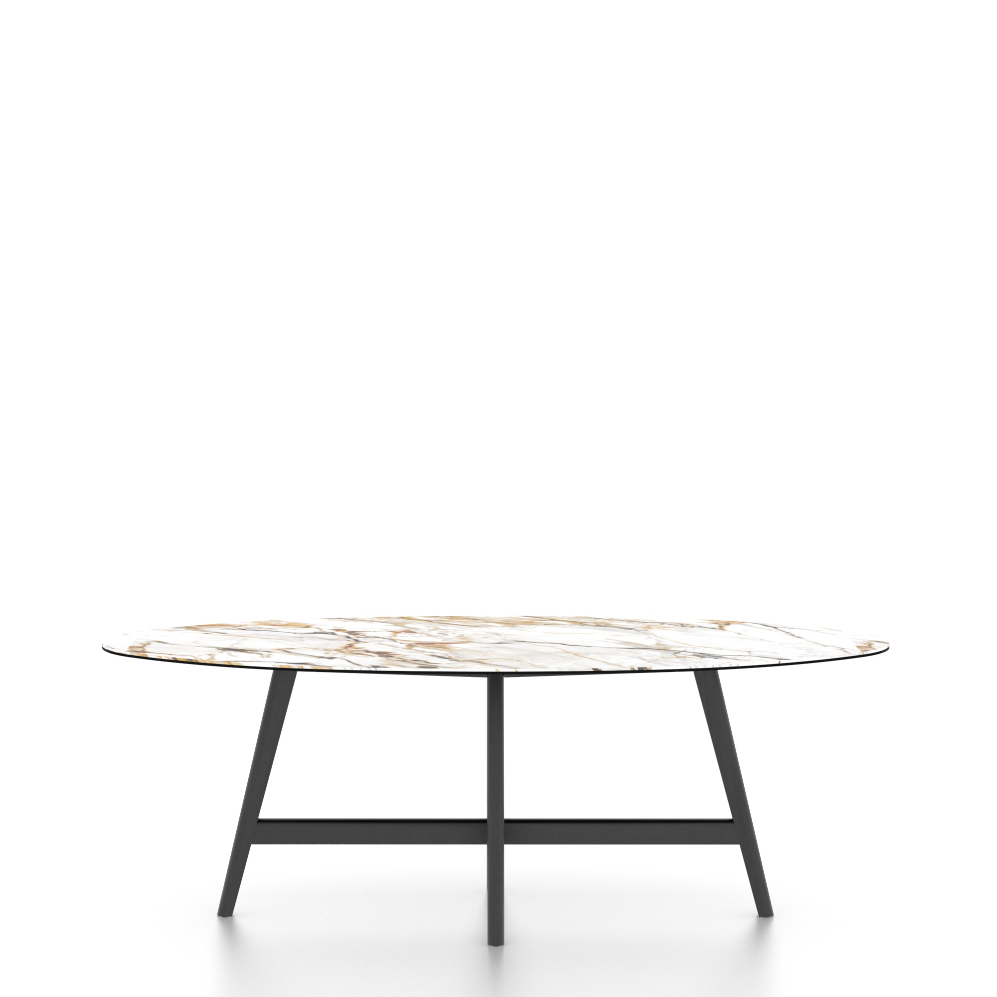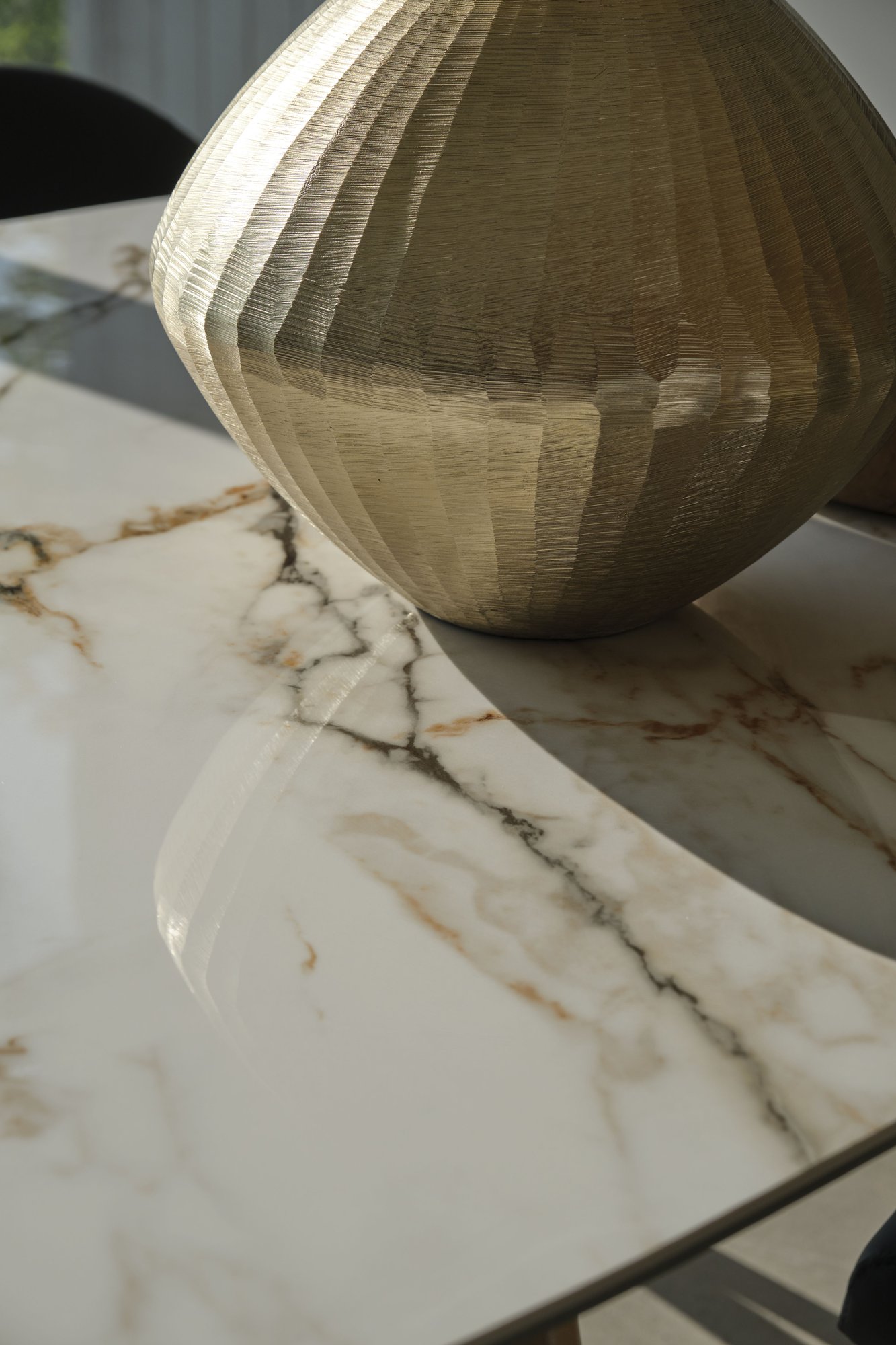 This phenomenal oval dining room table is one of a kind. A depiction of the contemporary style, this model will attract attention with its innovative shape, sleek legs and exquisite porcelain top.